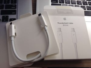 Amazonに違うとこが出してる物も売ってたんだけど、自分が買ったときは長いのしか売ってなかったのと、アフターマーケット品買うなら純正で安心したいという情弱的感覚が強まりApple製Thunderboltケーブルを購入。そんな値段も変わらなかったしね。