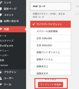 - 「PHP コード」をクリックして、どの領域にウィジェットを追加したいかを選んで追加ボタンを押す